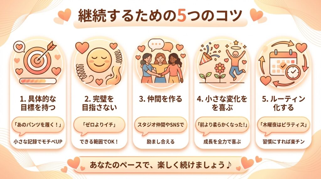 「お風呂上がりはストレッチ」「木曜の夜はスタジオ」と、歯磨きのように生活の一部にしてしまいましょう。