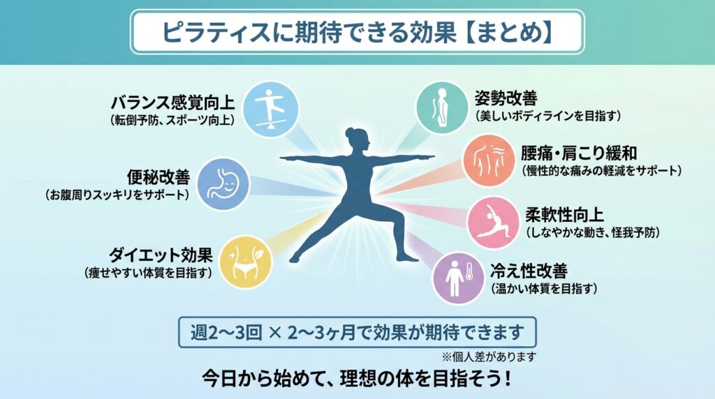 ここまで、ピラティスがもたらす身体的効果について解説してきました。要点を振り返ってみましょう。
