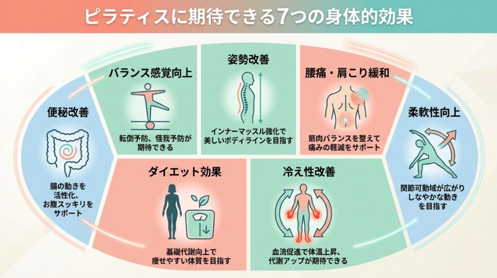 それでは、ピラティスを継続することで得られる具体的な7つの効果について詳しく解説していきます。