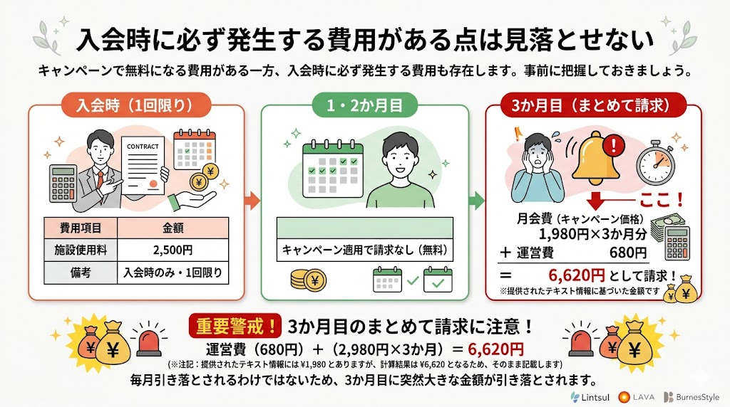キャンペーンで無料になる費用がある一方、入会時に必ず発生する費用も存在します。